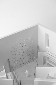 En ce qui concerne les patios, nous avons voulu instaurer une gradation des espaces communs aux espaces plus privés : ainsi le patio commun est occupé par un mur d'escalade, un autre patio proche de la bibliothèque permettra de se relaxer et pourra accueillir tous les habitants. Deux patios plus privés seront seulement accessibles par les chambres concernées.